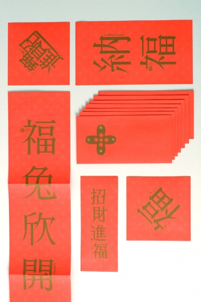 LaFou designed the New Year's Survival Bag to wish clients and friends all have a great 2011. The kit contained calendar, red envelopes and red couplets, all the products that you may need during the spring festival. Use red and gold to emphasize the main idea of Chinese New Year,no extra colors and patterns, different from the products outside.