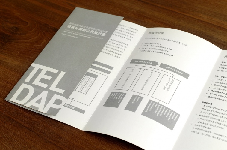 中研院將數位典藏與數位學習國家型科技計畫,分為建置整合 / 公開徵選 / 研發 / 組織表。樂福依據此四大類,選取四種顏色做為區分,以簡單俐落的原則做為排版的指標,讓閱讀者能一目了然,不至於被多餘的圖像混淆。