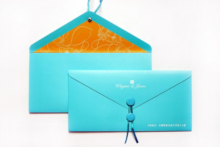 有別於一般傳統大紅喜氣的設計,大膽使用典雅的松石綠,內襯手繪花紋,更顯尊貴優雅氣質。