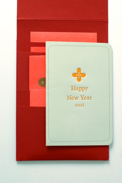 LaFou designed the New Year's Survival Bag to wish clients and friends all have a great 2011. The kit contained calendar, red envelopes and red couplets, all the products that you may need during the spring festival. Use red and gold to emphasize the main idea of Chinese New Year,no extra colors and patterns, different from the products outside.