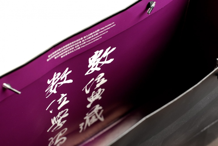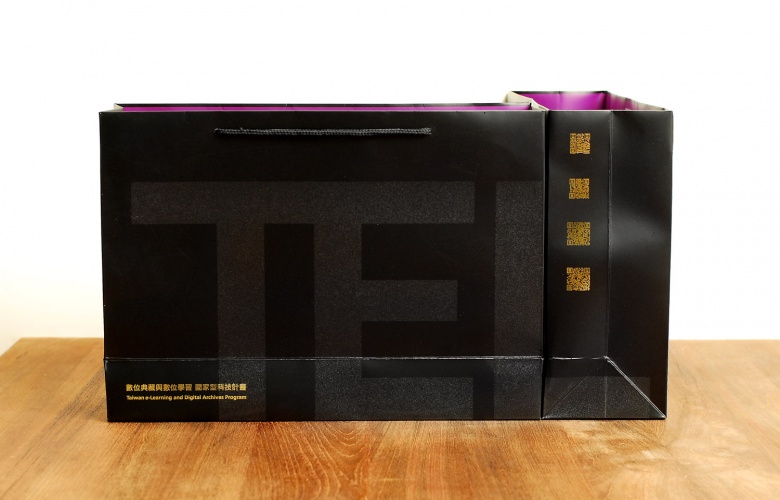 樂福為中研院數位典藏與數位學習單位設計提袋一只,選用黑色為底,搭上黑色磨砂並將字體燙金,內襯以紫色為主佐以書法字體為輔,強化視覺意象。